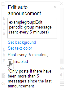 Send a set message in the chat at a specified interval. Log in to your group as the owner. Click the Main menu then choose Auto announcements.