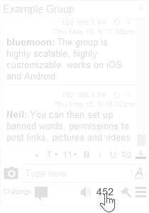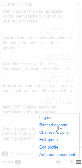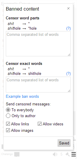 Group owners and administrators can ban certain words from a chat. To set the banned words you must be logged in to the HTML 5 version of the chat as the group owner and click the Main menu > Banned content.