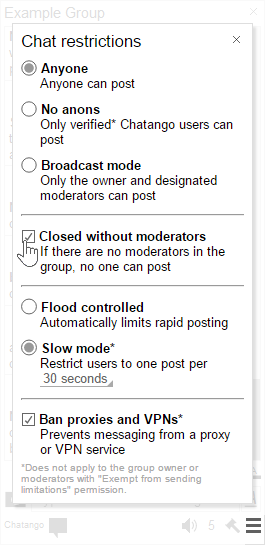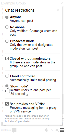 Restrict users to one post per 30 seconds, or an interval that you set. This does not apply to the owner, and moderators can be exempted from this limitation. Log in to your group as the owner. Click the Main menu then choose Chat restrictions and choose Slow mode.