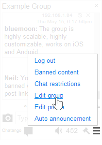 If you need to get HTML code again to put your group on another web page, click on Chatango logo at the bottom of your group, and choose Get Code for this Group from the menu.