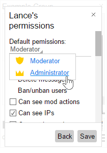 Moderators can ban users and delete messages, and perform other group administrative tasks, depending on their permission levels. We suggest that you make enough moderators so that there's always a moderator in a chat over 300 people. To make new moderators you must be logged in as the owner or administrator and click Moderation menu Add/remove moderators.